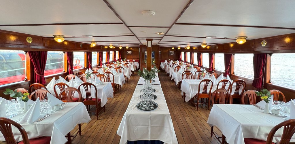 I den vackra matsalen kan ni alla sitta samlade och har utsikt över vattnet i fönstren med fint ljusinsläpp. Efter middagen kan ni samlas på övre däck, och ha dans på yttre däcket eller sitta och prata med ett glas vin i övre salongen.