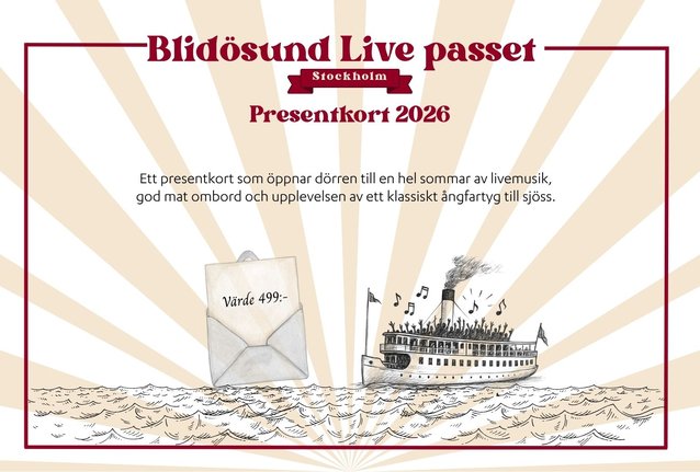Ge bort eller unna dig själv Blidösund Live Passet – köp ditt presentkort till våra musikkryssningar i Stockholm säsongen 2026.