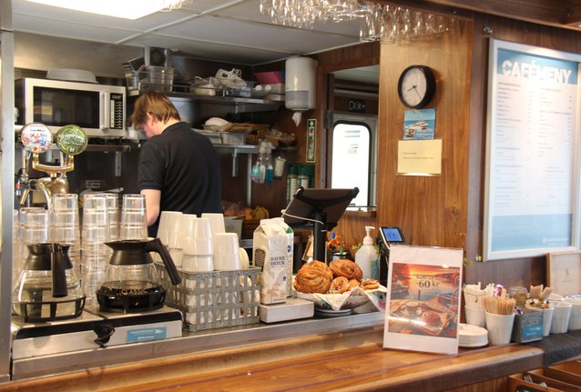 If you visit the onboard cafés, you will find freshly baked rolls, pastries, snacks, and ice cream. We also serve coffee/tea, soft drinks, beer, and wine.