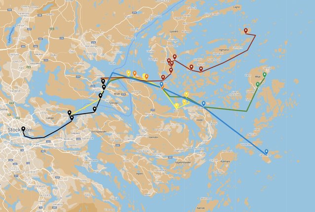 S/S Storskär trafikerar Möja (grön) på lördagar och på söndagar Husarö (röd). S/S Norrskär erbjuder helgkryssningar till Gällnö (gul) på lördagar och Grinda (orange) på söndagar under vår och höst. Under sommaren är destinationen Sandhamn både lördag och söndag. Alla helgkryssningar är tur och retur.