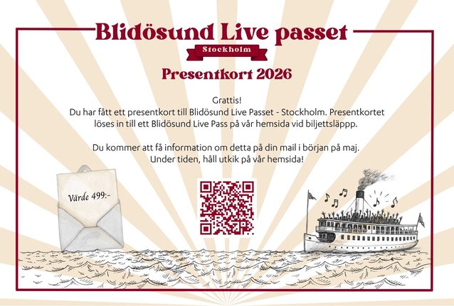 Blidösund Live i Stockholm erbjuder nu ett presentkort – Sthlm Live Passet Presentkort (värde 499 kr) – som ger mottagaren möjlighet att aktivera Blidösund Live Passet inför sommarens musikkryssningar 2026. Presentkortet fungerar som en förtur: genom att prenumerera på nyhetsbrevet får man information om artistsläppet och kan då lösa in kortet och aktivera passet, vilket inkluderar den första biljetten. Därefter kan man köpa en biljett per spelning för 100 kr. Passet är personligt och gäller endast för Blidösund Live i Stockholm.