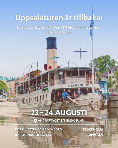 Biljettsläpp! Nu är biljetterna släppta till den populära turen med S/S Blidösund mellan Stockholm och Uppsala den 23–24 augusti. Följ med på en stämningsfull resa genom Mälarens vackra vattenvägar, med stopp i historiska Sigtuna. Begränsat antal platser – boka din biljett idag!