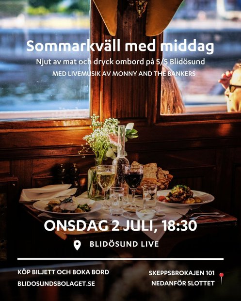 Onsdag 2 juli – sommarkväll ombord du inte vill missa! Boka en plats på klassiska S/S Blidösund och njut av en god middag i Stockholms skärgård, medan solen går ner och Monny and the Bankers bjuder på svängig livemusik.